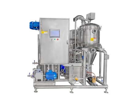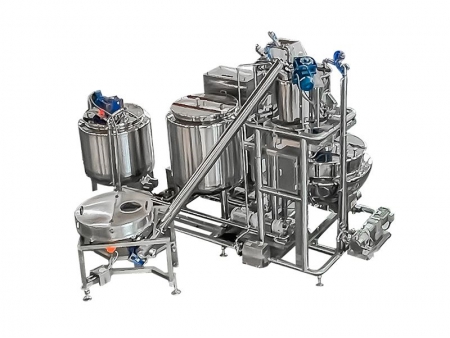 Ce dispositif est doté d'un système automatique de pesage et de mélange des ingrédients pour la précuisson de la bouillie de pectine, au cours de laquelle la poudre de pectine, le sucre en poudre et l'eau sont mélangés de manière homogène. Il permet de renforcer le goût des bonbons finis, même s'ils sont de qualité variable en raison de la diversité des matières premières. Un seul réservoir de pesage en acier inoxydable est installé sur trois cellules de charge prévues pour un poids maximal de 180 kg. Après le pesage, tous les matériaux entreront dans le cuiseur à double paroi doté d'une cisaille à grande vitesse, dans laquelle la poudre de pectine et le sucre en poudre seront entièrement dissous. Une fois que les ingrédients sont introduits dans le cuiseur, le sirop sera transmis au réservoir de retenue pour la phase suivante de la production. Le réservoir de stockage est une cuve de rétention pour les liquides chauds ou froids et les boues. La machine entière est constituée de plusieurs composants hautement automatisés, notamment un agitateur en acier inoxydable et une station autovidante. En outre, le lavage est relativement aisé puisque la structure en acier inoxydable peut être lavée directement. Tous les tuyaux sont dotés de filtres tubulaires, qui permettent d'éliminer les impuretés présentes dans le liquide afin de garantir la propreté du sirop et de respecter les normes d'hygiène et de sécurité. Par ailleurs, le système de contrôle par API permet de stocker jusqu'à dix recettes préétablies.